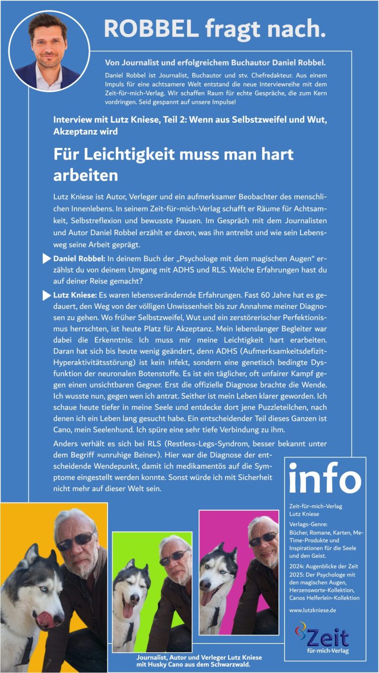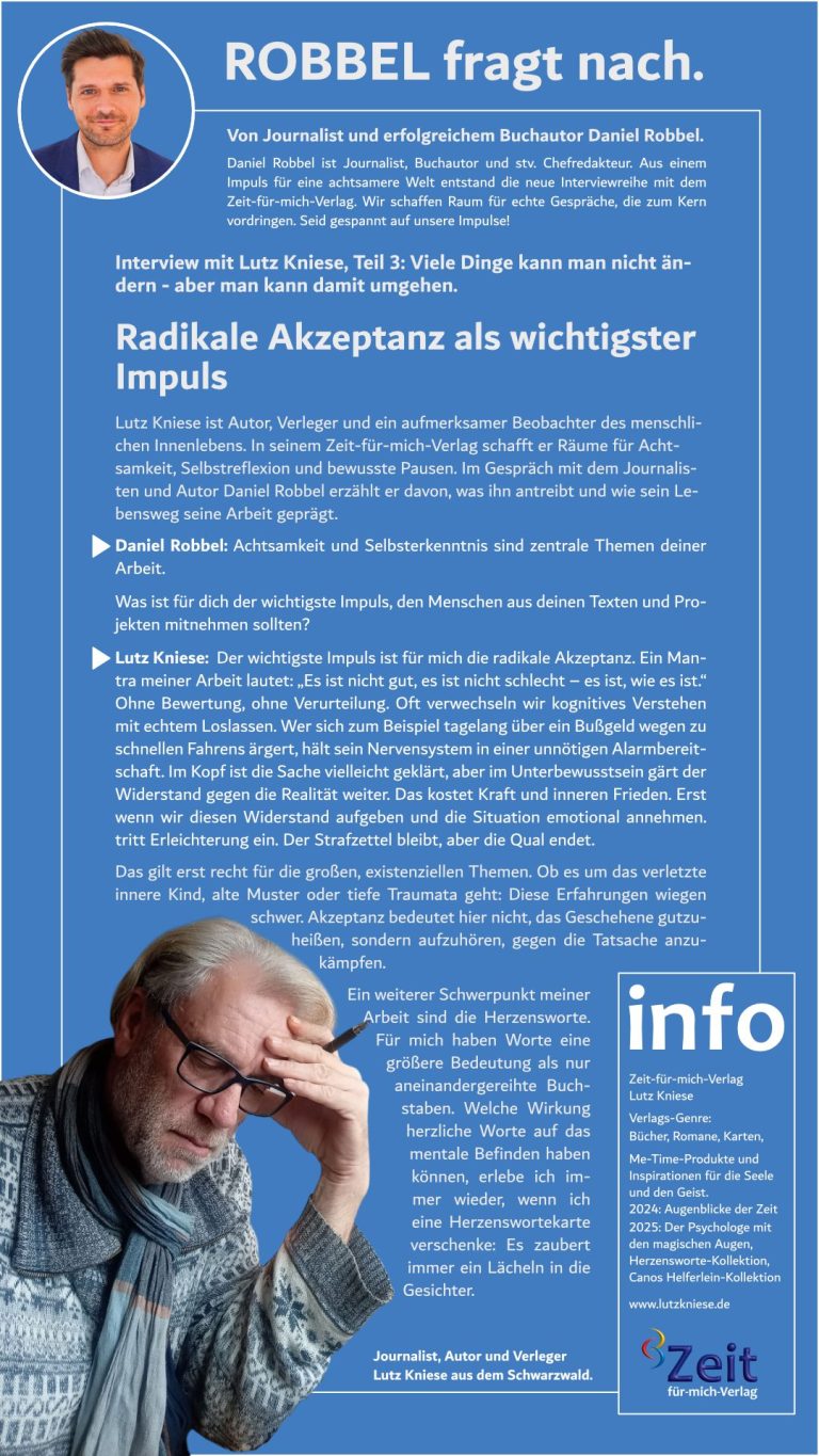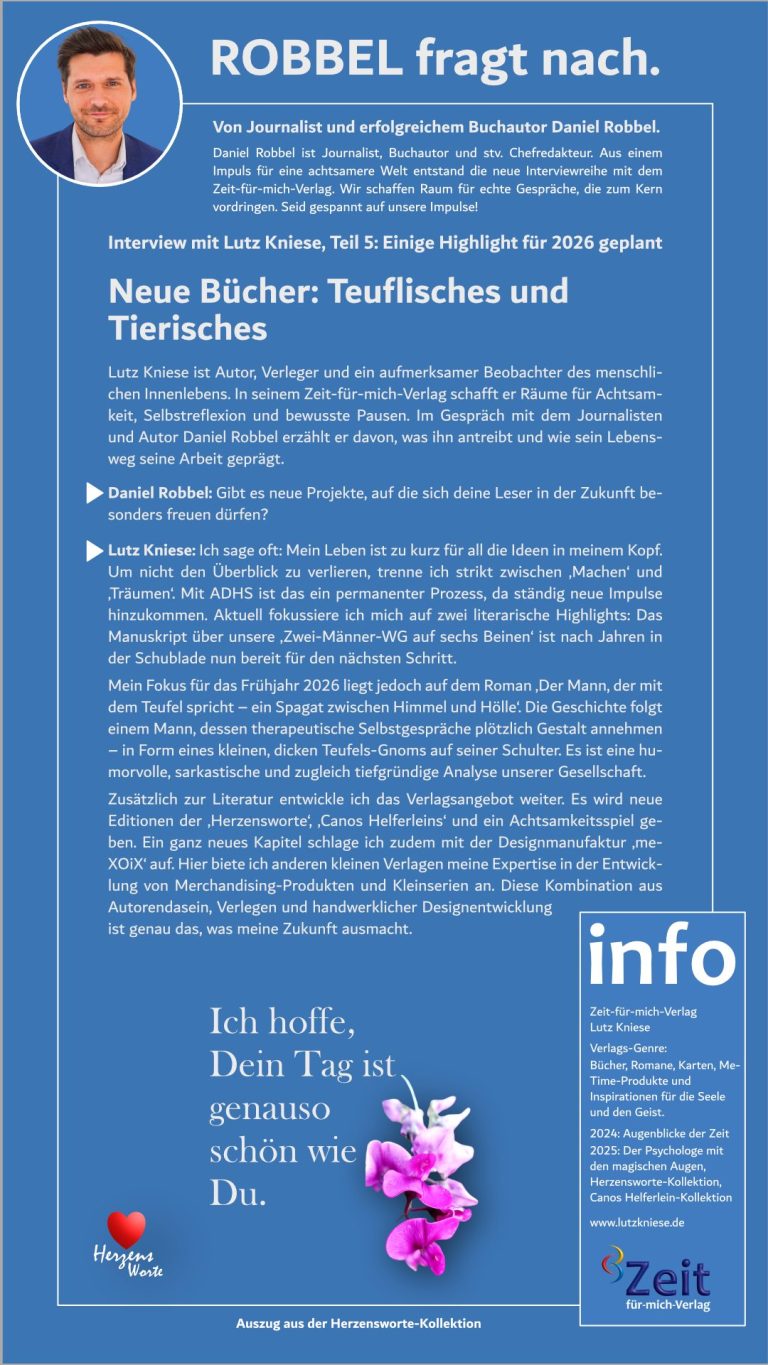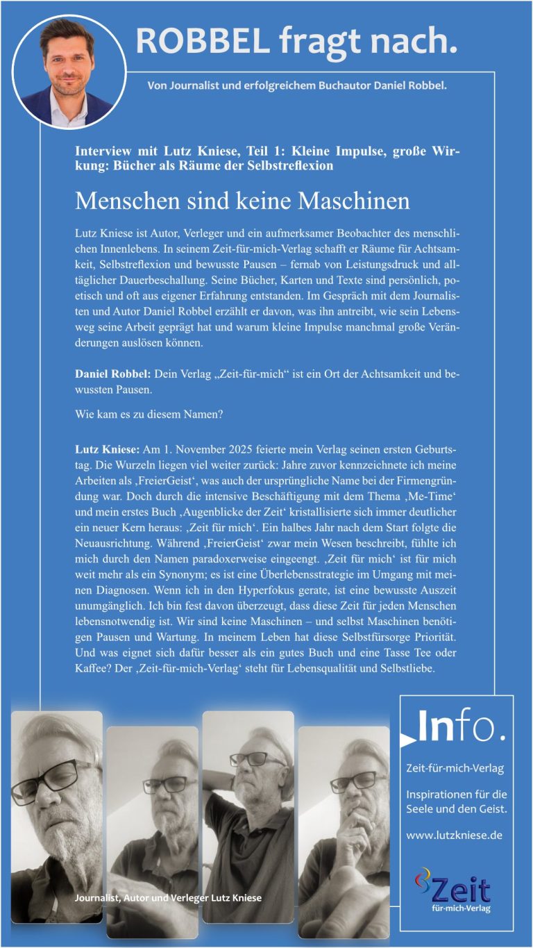 Lutz Kniese ist Autor, Verleger und ein aufmerksamer Beobachter des menschlichen Innenlebens. In seinem Zeit-für-mich-Verlag schafft er Räume für Achtsamkeit, Selbstreflexion und bewusste Pausen – fernab von Leistungsdruck und alltäglicher Dauerbeschallung. Seine Bücher, Karten und Texte sind persönlich, poetisch und oft aus eigener Erfahrung entstanden. Im Gespräch mit dem Journalisten und Autor Daniel Robbel erzählt er davon, was ihn antreibt, wie sein Lebensweg seine Arbeit geprägt hat und warum kleine Impulse manchmal große Veränderungen auslösen können.