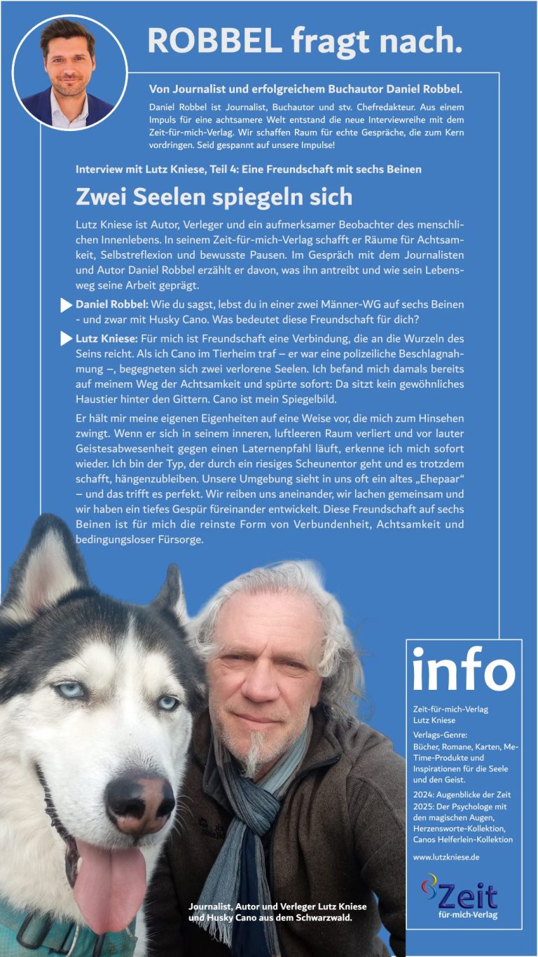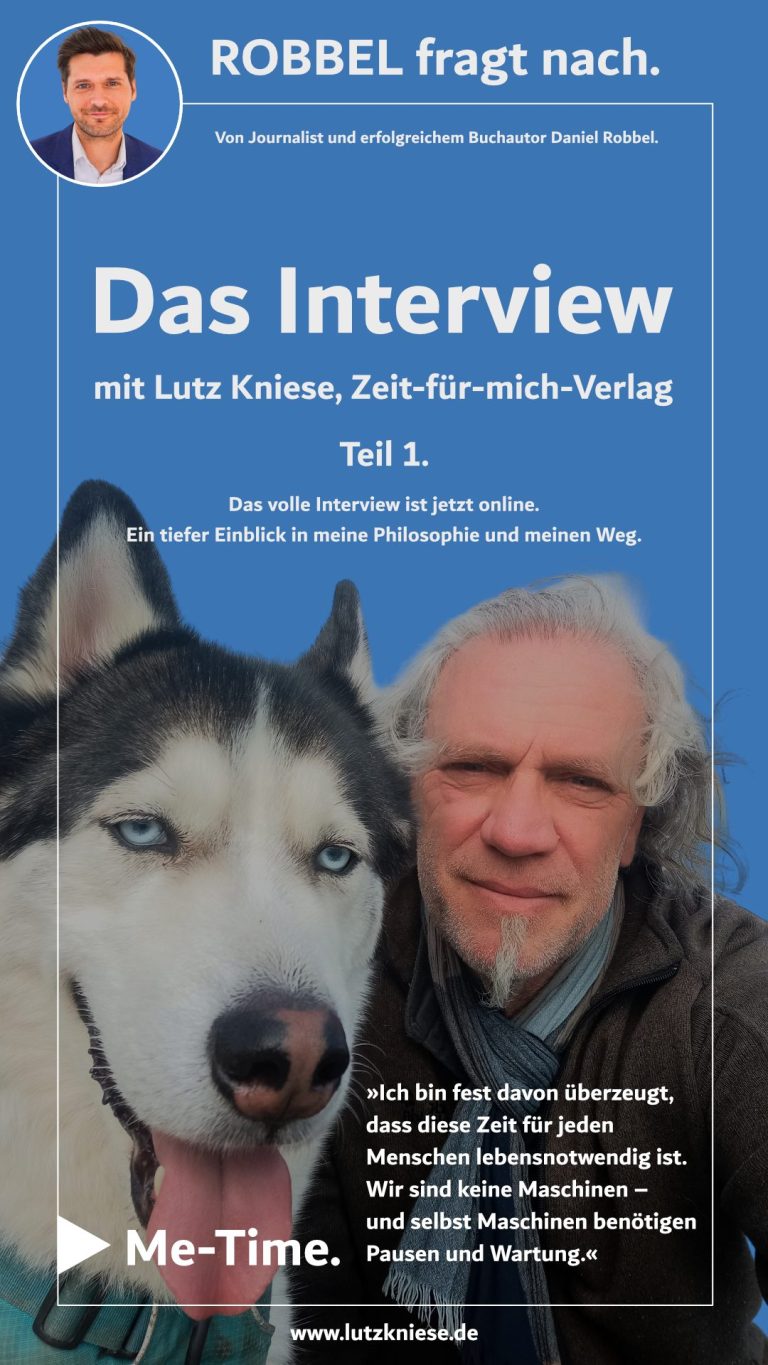 Lutz Kniese ist Autor, Verleger und ein aufmerksamer Beobachter des menschlichen Innenlebens. In seinem Zeit-für-mich-Verlag schafft er Räume für Achtsamkeit, Selbstreflexion und bewusste Pausen. Im Gespräch mit dem Journalisten und Autor Daniel Robbel erzählt er davon, was ihn antreibt und wie sein Lebensweg seine Arbeit geprägt.